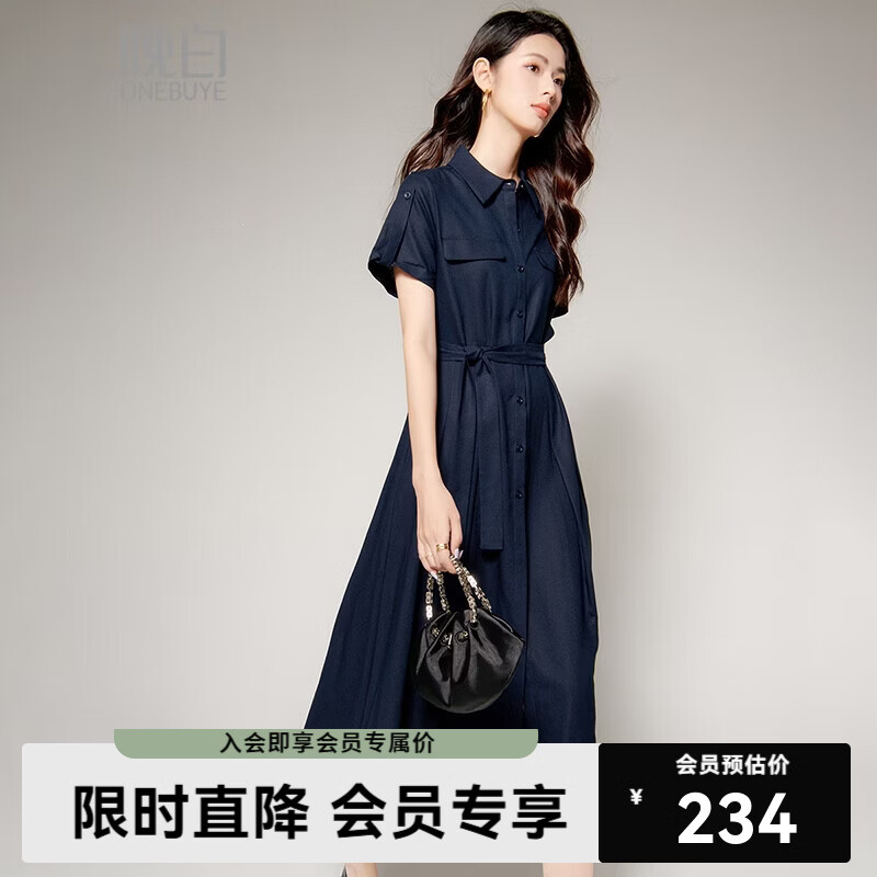 晚白【新品】2026年春款经典翻领棉麻裙子系带收腰干练通勤短袖连衣裙 深蓝色 L
