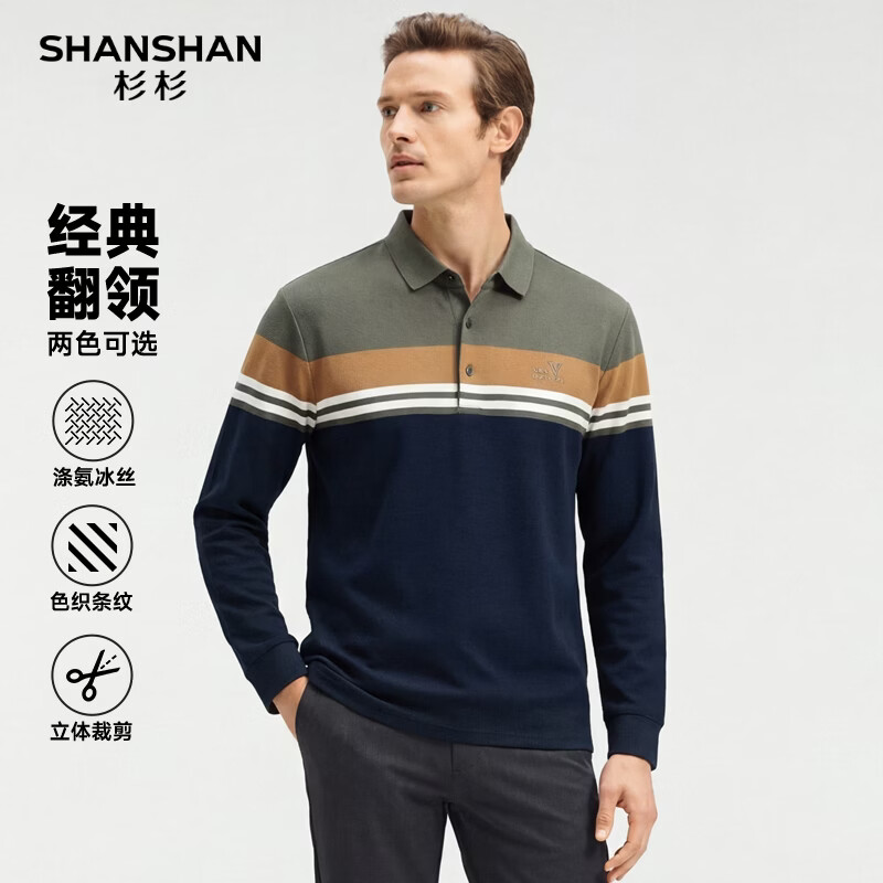 SHANSHAN杉杉长袖T恤男春季2026新款商务休闲男士POLO衫撞色简约男上衣 灰绿色 L /175