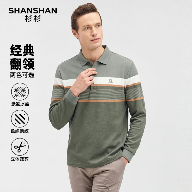 SHANSHAN杉杉男士长袖T恤2026春秋季新款条纹弹力Polo衫休闲爸爸装上衣男 灰绿色 2XL /185