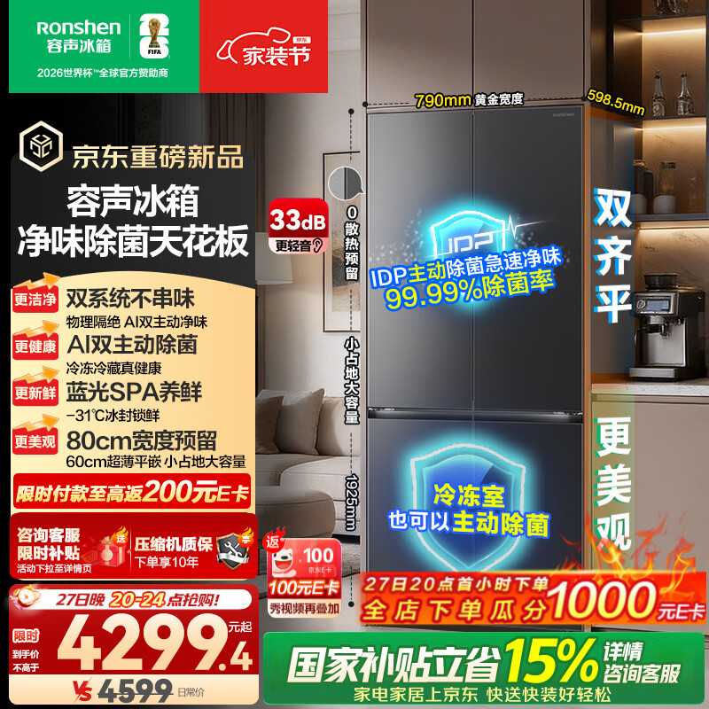 容声方糖505L(2.0)十字门冰箱双系统循环主动除菌超薄嵌入式一级能效无霜大容量灰国家补贴 BCD-505Q50CZLBD灰