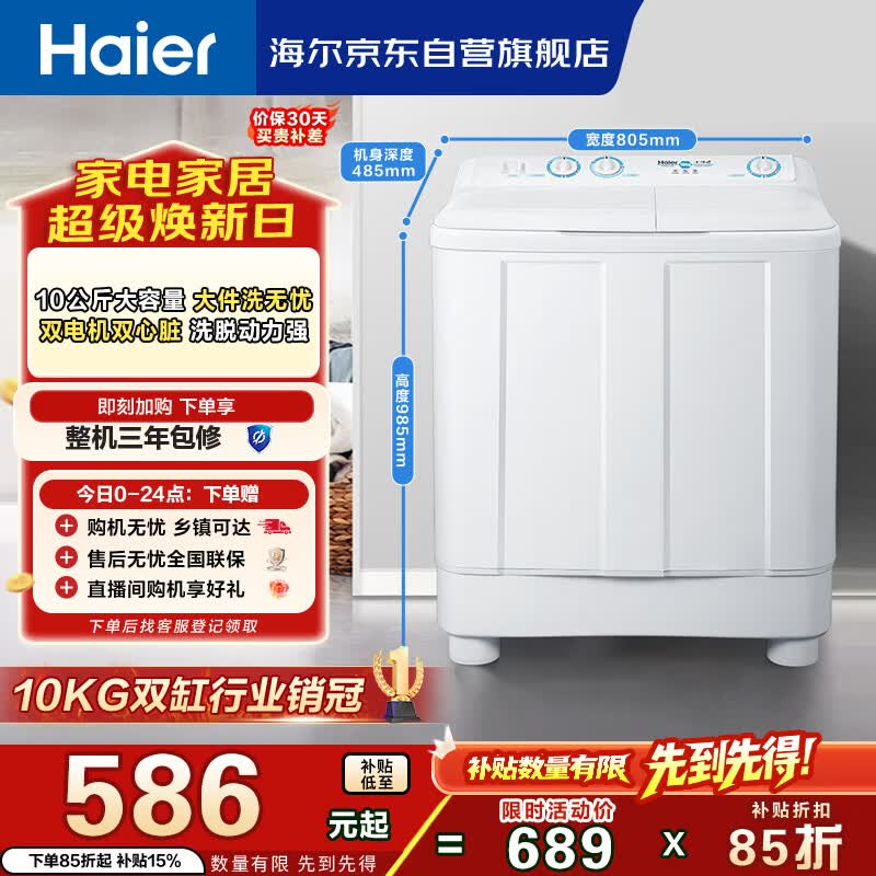 海尔(Haier)半自动双桶洗衣机 10KG 双电机双缸 家电国家补贴以旧换新京东自营 XPB100-81D2