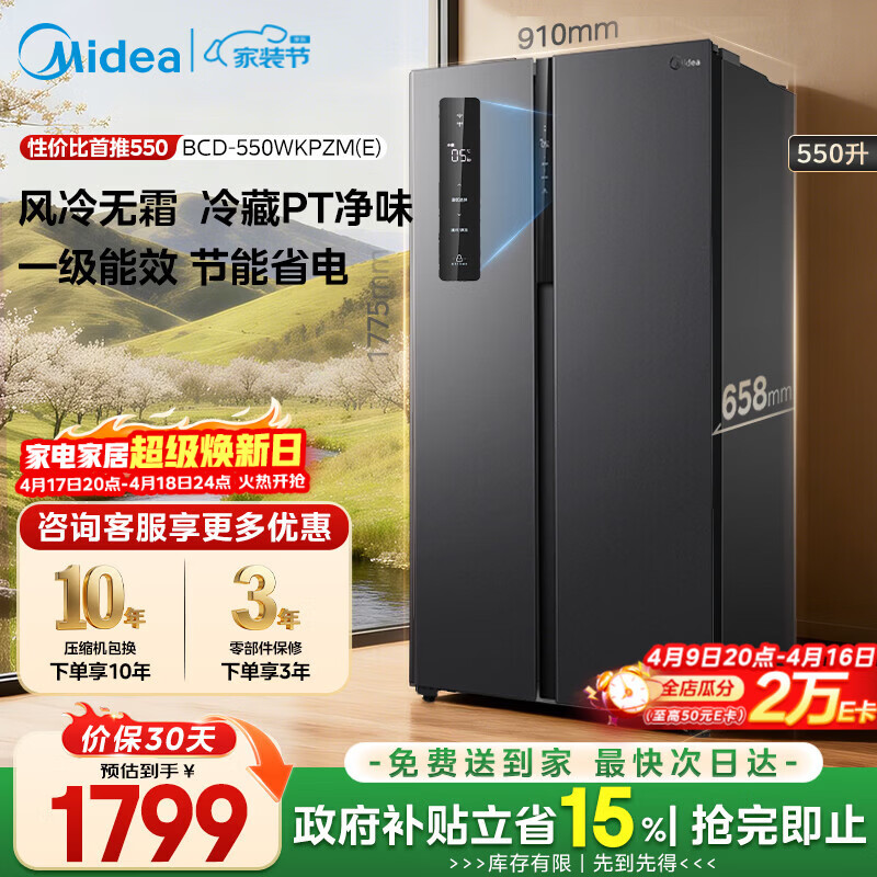 美的(Midea)550升双开门冰箱一级能效节能双变频风冷无霜大容量以旧换新BCD-550WKPZM(E)国家补贴