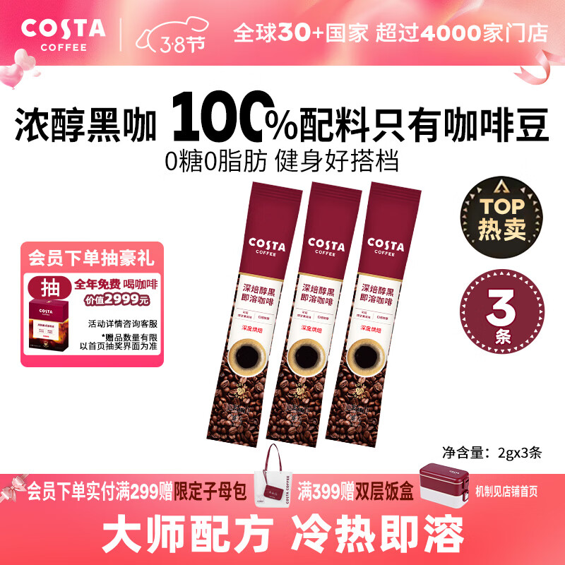 COSTA速溶咖啡美式深烘0糖0脂纯黑咖啡粉冷热即溶400次运动健身2g*3条