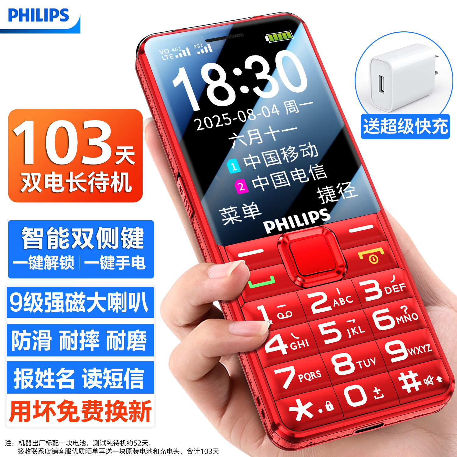 飞利浦(PHILIPS)L18老年人手机4G全网通超长待机大字大声音大屏老人专用手机按键学生戒网智能支付功能机 绚丽红