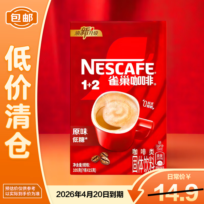 雀巢咖啡1+2原味双豆拼配条装即溶咖啡7条105g