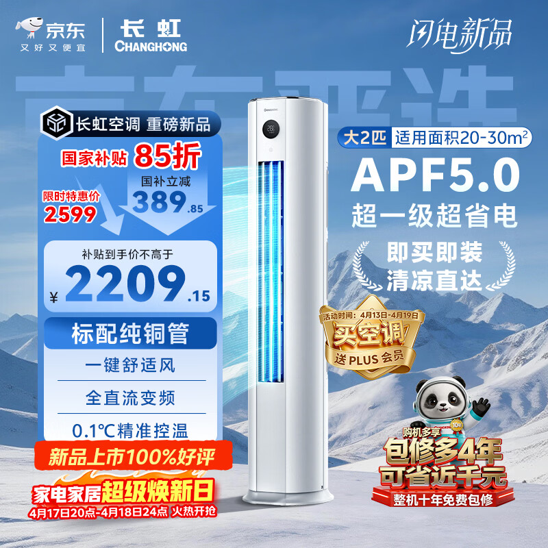 长虹空调 大2匹京东严选熊猫懒超一级超省电冷暖立式变频柜机空调国家补贴 KFR-51LW/JDC1+R1十年包修