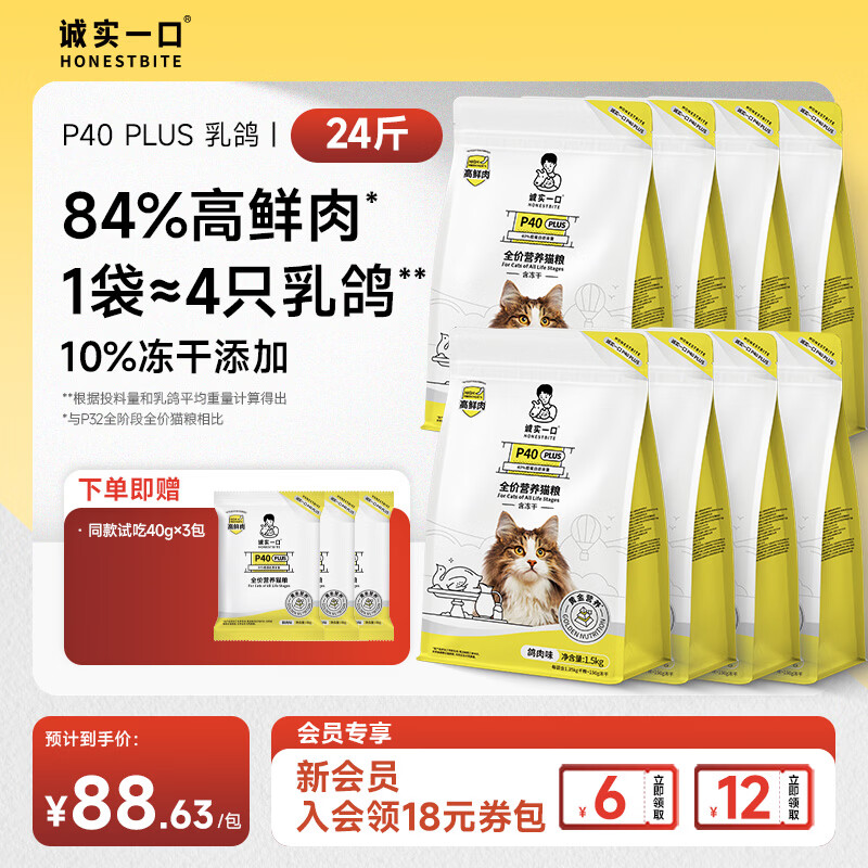 诚实一口P40 PLUS冻干猫粮成猫幼猫≥80%鲜肉长肉养胃多口味通用型 1袋≈4鸽 10%冻干丨乳鸽12kg