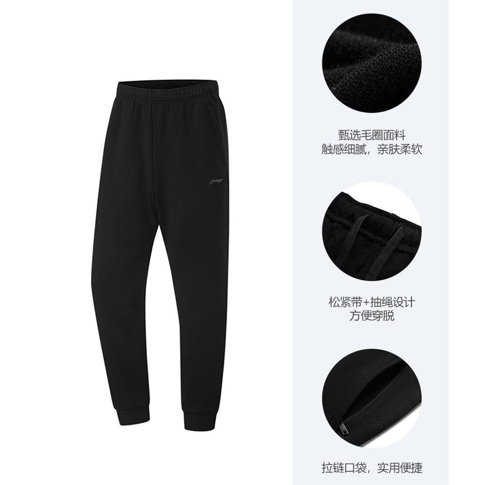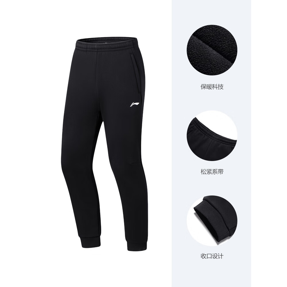李宁(LI-NING)卫裤男士加绒跑步裤子休闲裤直筒针织口袋拉链灰色运动长裤 秋冬加绒_收口_黑色A73-6 L