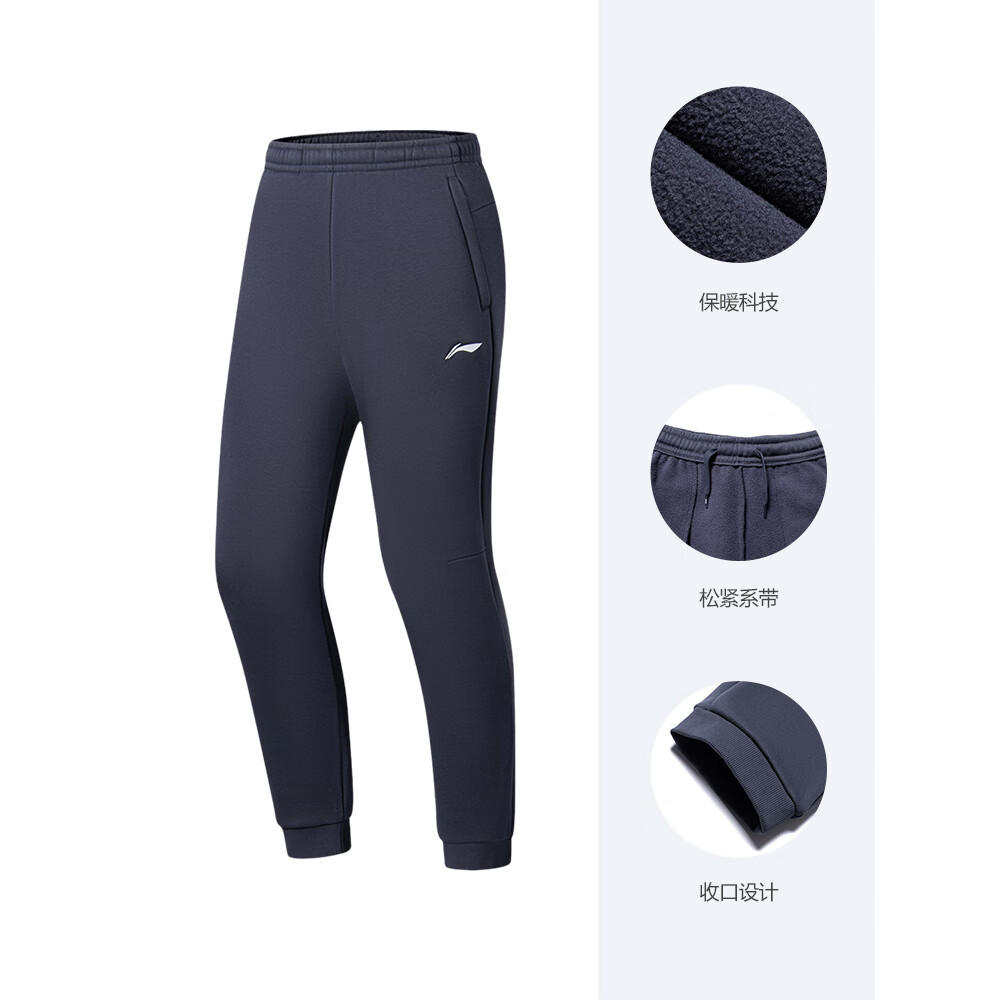 李宁(LI-NING)卫裤男士加绒跑步裤子休闲裤直筒针织口袋拉链灰色运动长裤 春秋棉质_收口_深海军蓝A73-5 M