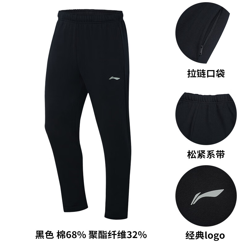 李宁(LI-NING)卫裤男士加绒跑步裤子休闲裤直筒针织口袋拉链灰色运动长裤 春秋棉质_直筒_黑色A75-3 S
