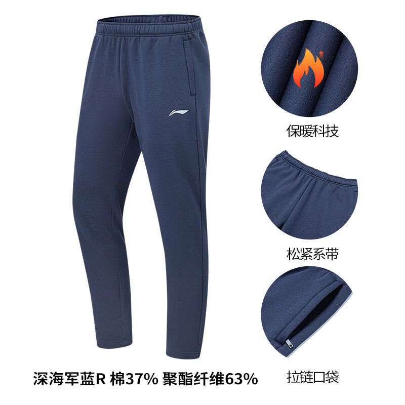 李宁(LI-NING)卫裤男士加绒跑步裤子休闲裤直筒针织口袋拉链灰色运动长裤 秋冬加绒_直筒_深海军蓝A75-6 S