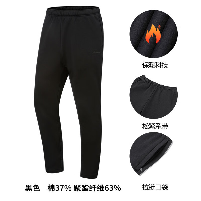 李宁(LI-NING)卫裤男士加绒跑步裤子休闲裤直筒针织口袋拉链灰色运动长裤 秋冬加绒_直筒_黑色A75-5 M