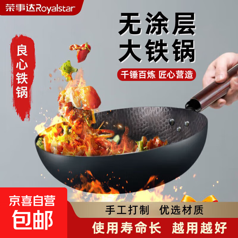 荣事达老式鱼鳞铁锅炒锅手工锻打无涂层物理不粘不生锈炒菜锅 炒锅 32cm