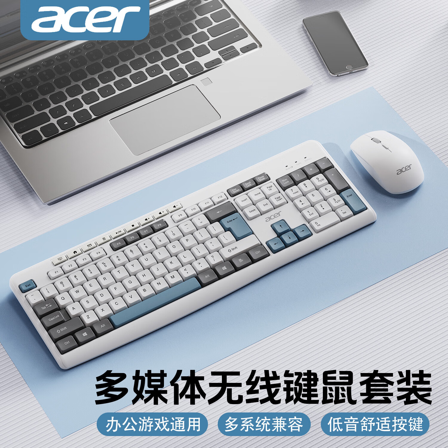 宏碁(acer)无线键盘鼠标套装可选静轻音按键高颜值拼色时尚百搭办公家用台式笔记本通用无线接收器即插即用 键盘鼠标套装(天青蓝)