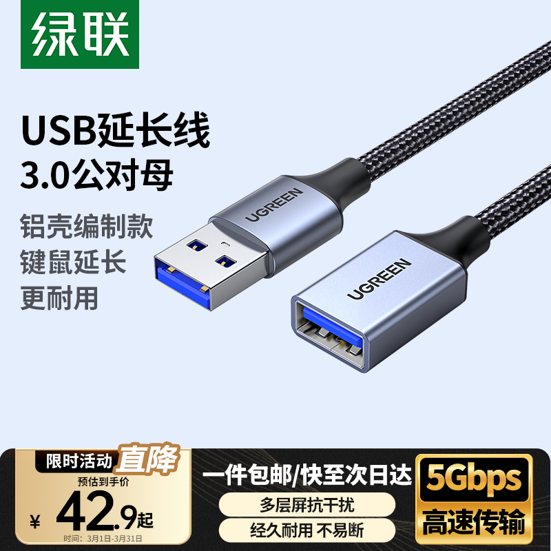 绿联 USB3.0延长线公对母高速传输镀金接口电脑U盘手机无线网卡键盘鼠标加长连接线 USB3.0【铝壳编制款】 1米