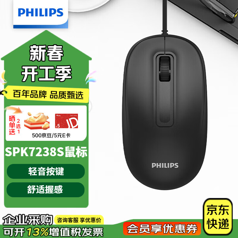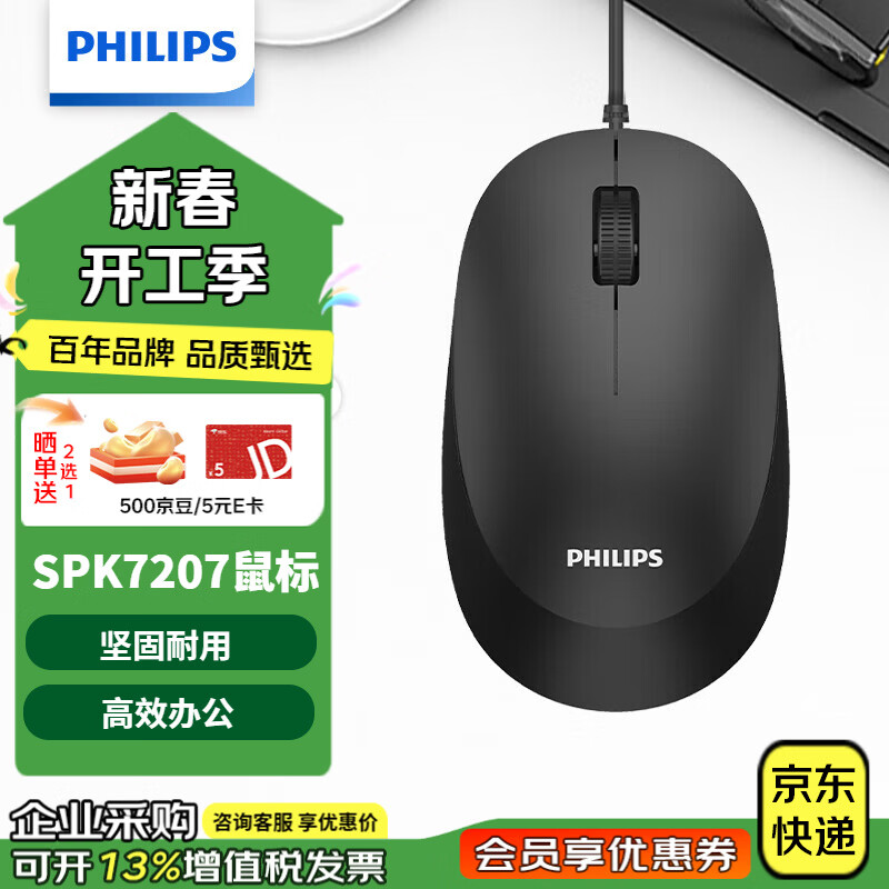 飞利浦(PHILIPS)M1(M6)有线鼠标 商务办公鼠标 USB即插即用 左右手对称鼠标 男女生mac笔记本台式电脑家用 M6黑色【USB有线】