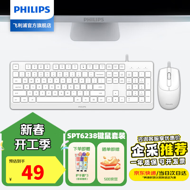 飞利浦(PHILIPS)MK120有线键鼠套装 键盘鼠标办公电脑笔记本台式机USB即插即用人体工学多系统兼容 颜值担当丨MK180白色【有线键鼠套装】