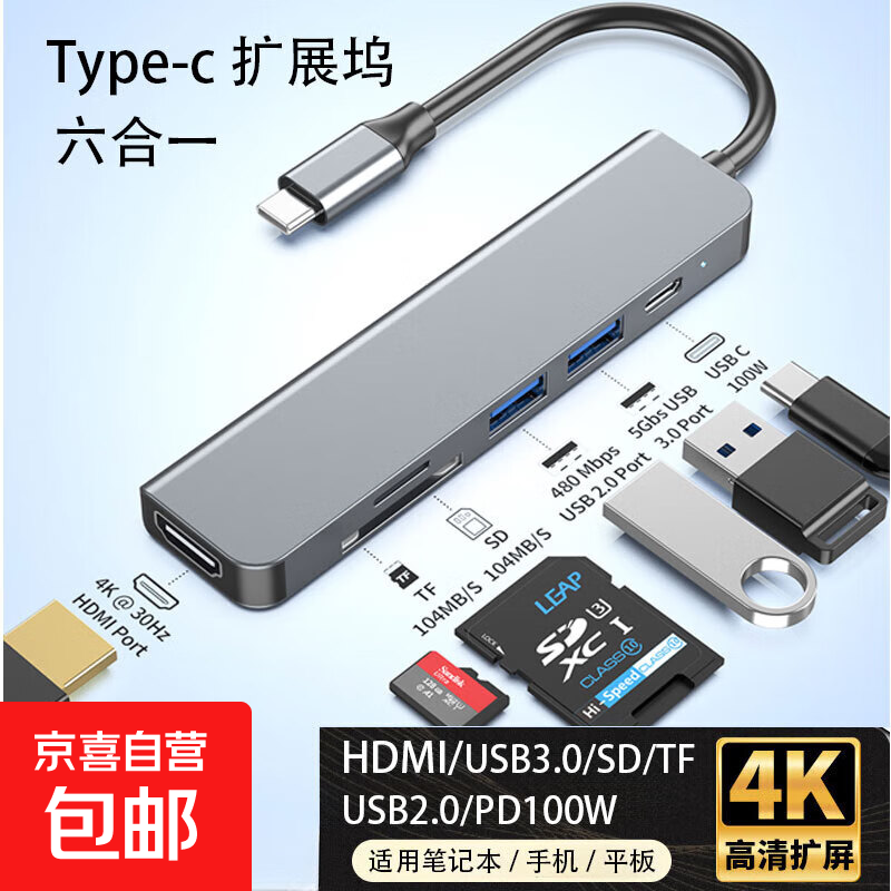 Type-C扩展坞HDMI网口RJ45拓展坞USB-C分线器PD快充转接头适用MacBook笔记本电脑iPad手机 6合1【HDMI+2USB+SD/TF+PD供电】