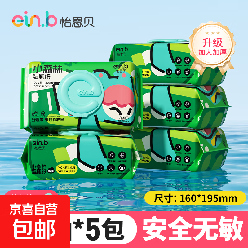 怡恩贝小森林湿厕纸家庭实惠装男女士专用擦屁股私处纯水洁厕湿巾 80抽*5包 【含一个圆形盖】