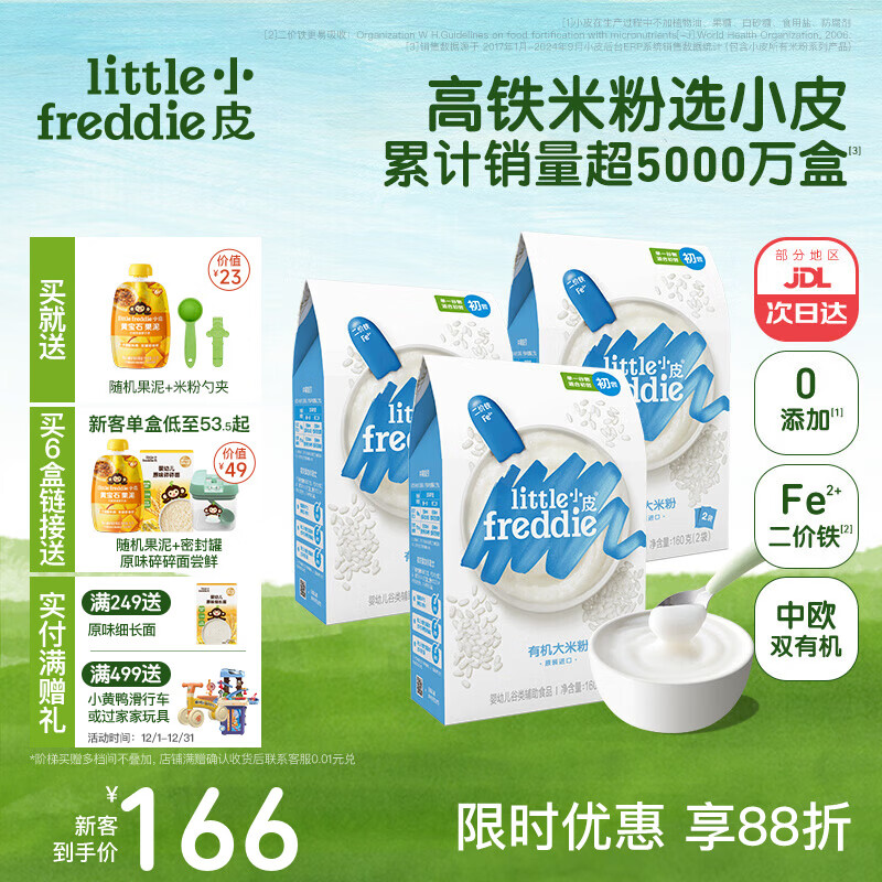 小皮(Little Freddie)高铁米粉有机 婴儿宝宝辅食营养低敏米糊米粉婴儿6个月以上 【4到6月+】原味有机大米粉*3盒