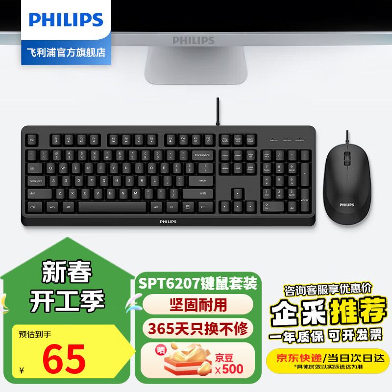 飞利浦(PHILIPS)MK120有线键鼠套装 键盘鼠标办公电脑笔记本台式机USB即插即用人体工学多系统兼容 工学丨K120黑+M6黑【有线键鼠套装】