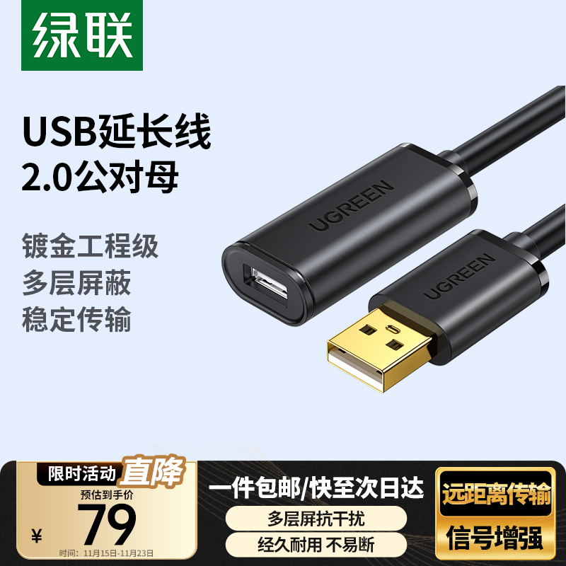 绿联 USB3.0延长线公对母高速传输镀金接口电脑U盘手机无线网卡键盘鼠标加长连接线 USB2.0【信号增强丨工程款】 10米