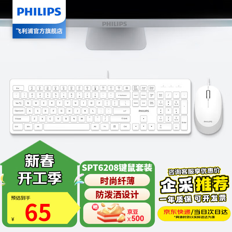 飞利浦(PHILIPS)MK120有线键鼠套装 键盘鼠标办公电脑笔记本台式机USB即插即用人体工学多系统兼容 颜值担当丨MK125白色【有线键鼠套装】