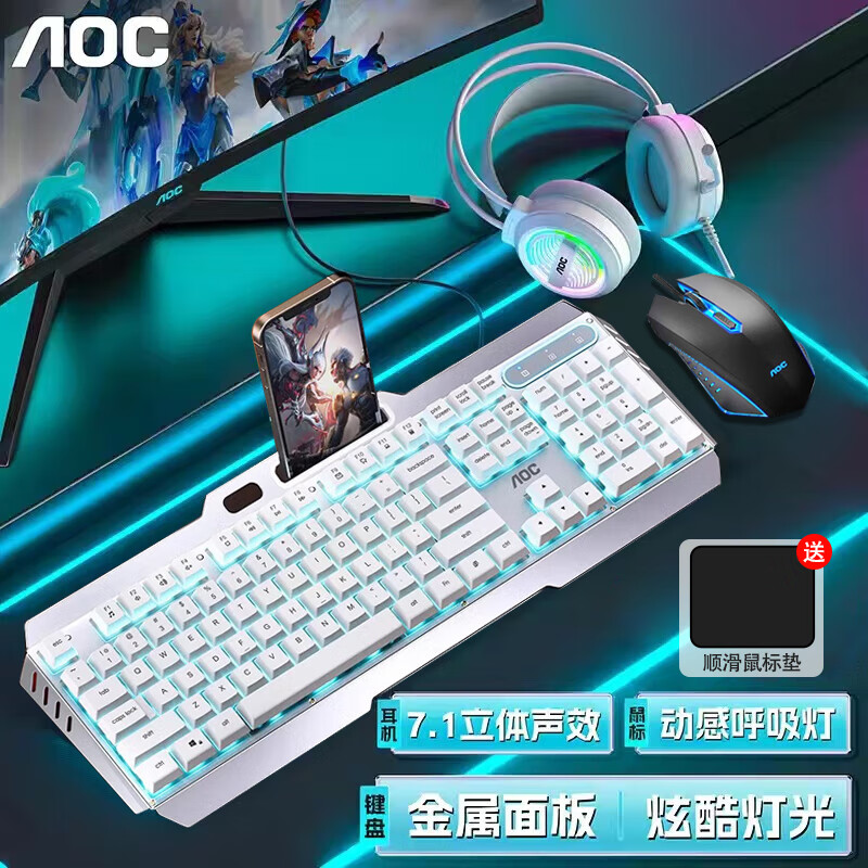 AOCKB122有线真机械手感键盘鼠标套装游戏发光台式电脑USB外设笔记本办公lol吃鸡网吧电竞键盘 白色冰蓝光电竞全家桶【键盘+耳机+鼠标+垫】