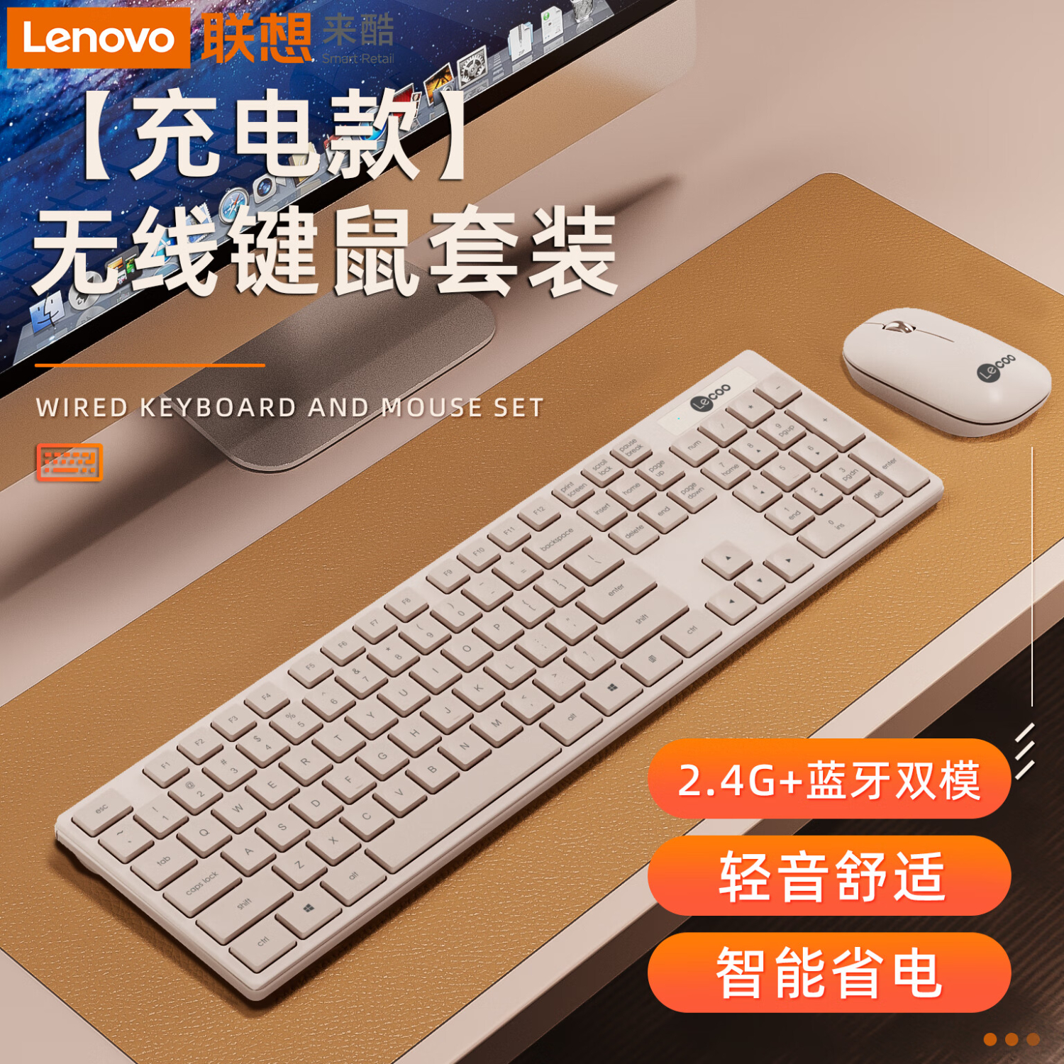 联想(lenovo)键盘鼠标套装 薄膜键盘有无线办公静音办公外接键盘便携 人体工学台式笔记本电脑键盘 充电款键鼠套装白色【无线】