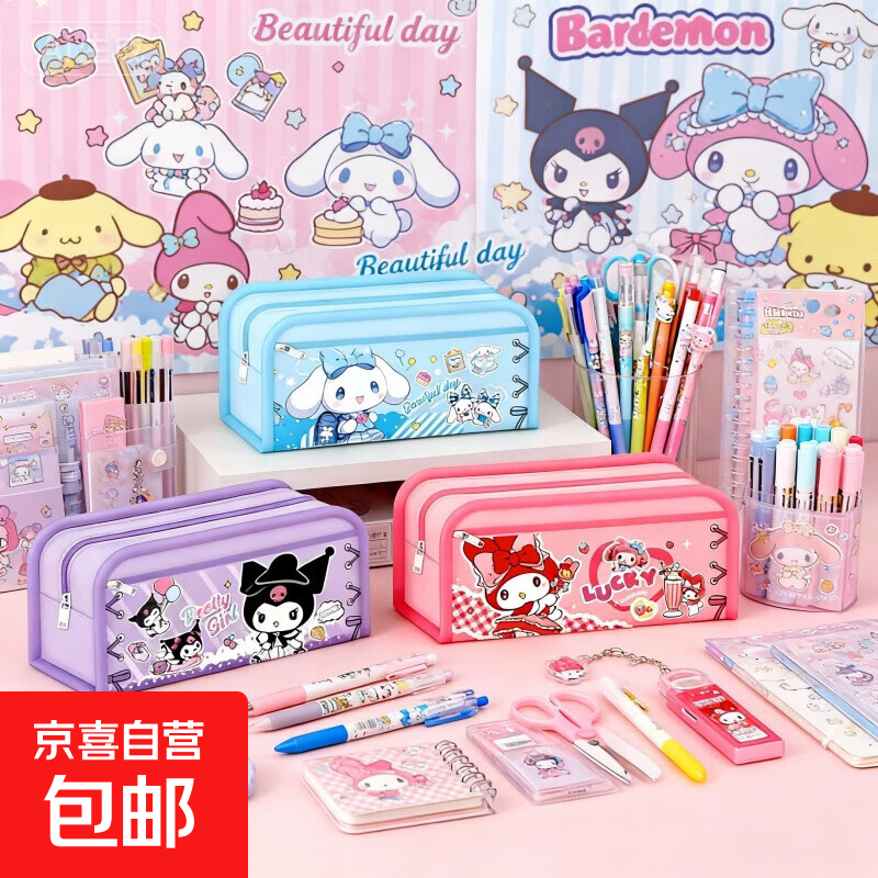 学生笔袋大容量文具收纳用具励志文字动物可爱风ins风金榜题名学生开学毕业礼物全班 三丽鸥大容量双层双拉链笔袋(随机发货可备注男女款)