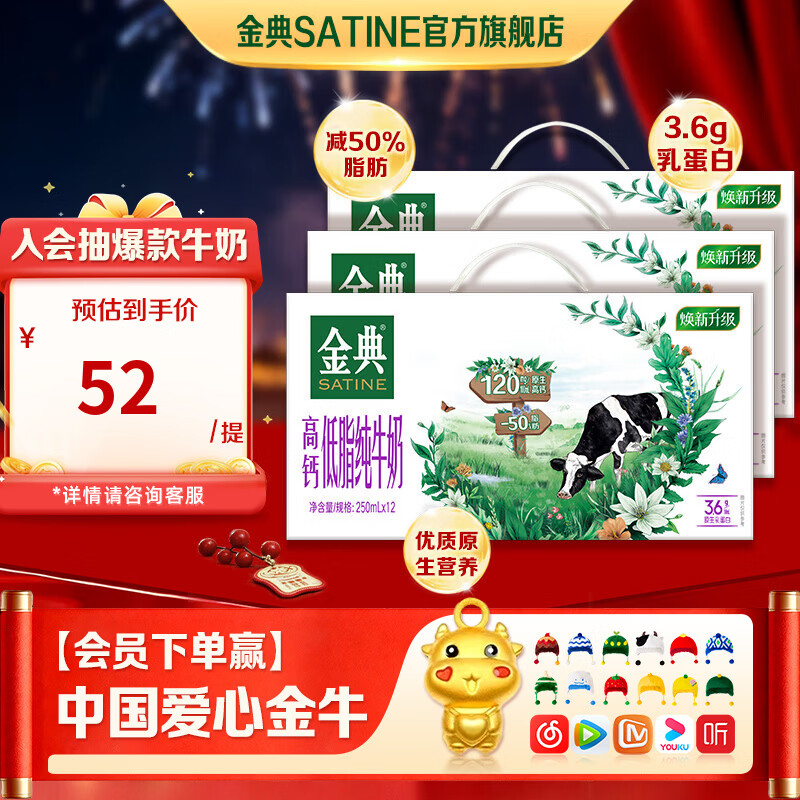 金典(SATINE)高钙低脂纯牛奶 3.6g乳蛋白 伊利牛奶整箱送礼 9月产 高钙低脂纯牛奶250ml*12盒*3箱