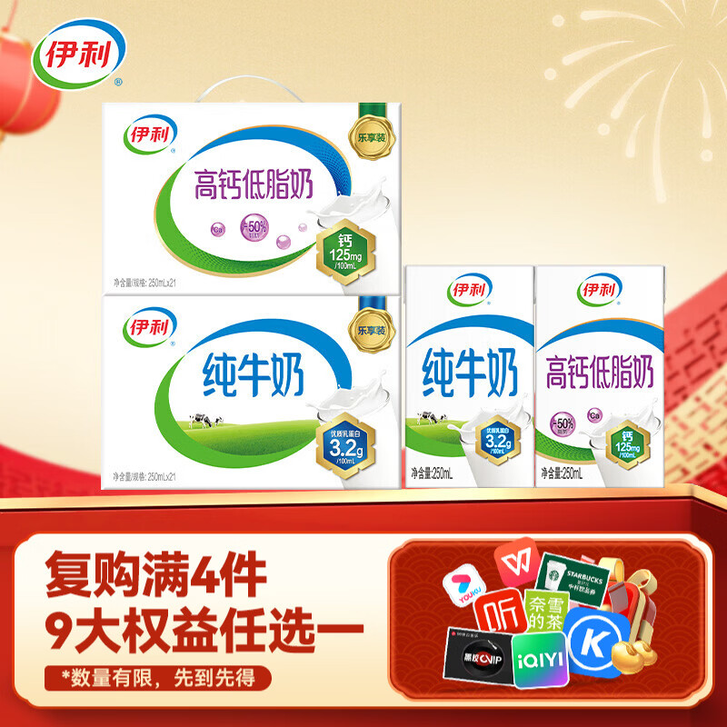 伊利纯牛奶250ml*21盒/箱+高钙低脂奶250ml*21盒/箱 礼盒装 10月产 早餐搭档