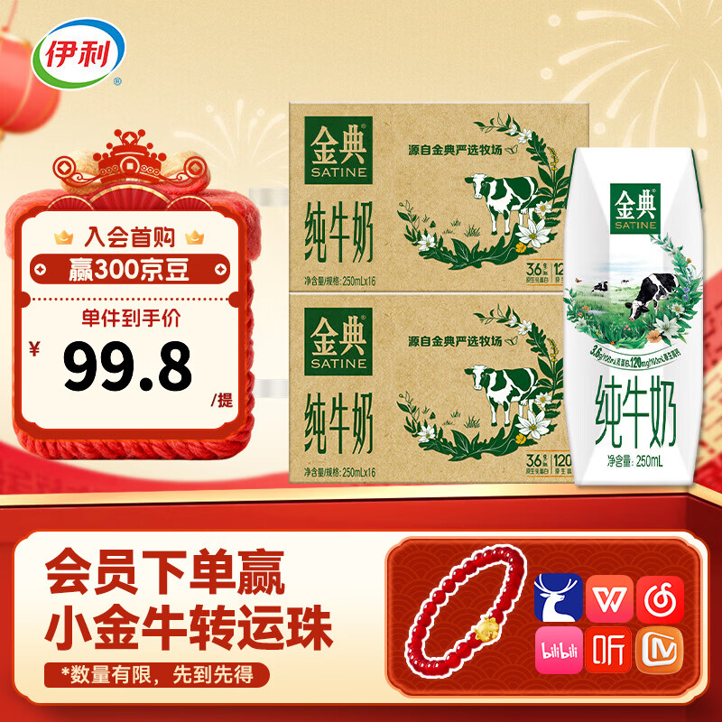 伊利金典纯牛奶250ml*16盒/箱 双提装 优质乳蛋白 礼盒装 9-10月产