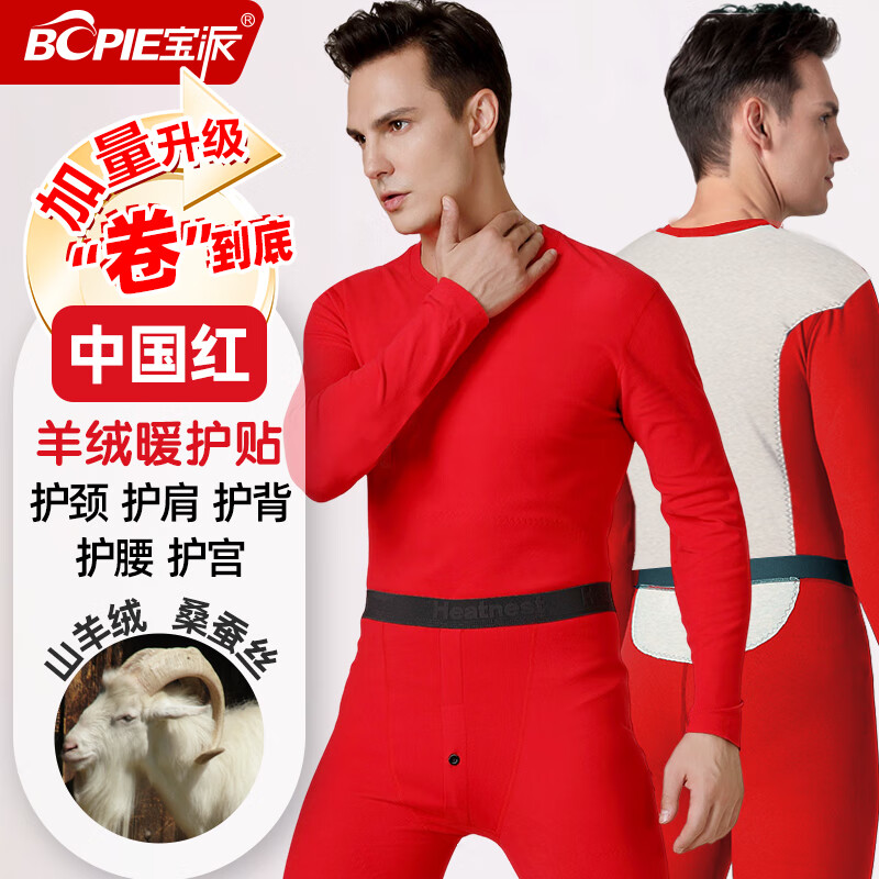 宝派保暖内衣套装男无痕羊绒暖护贴抗菌加绒圆领打底秋衣秋裤女秋冬季 羊绒暖护贴PLUS版男大红 XL