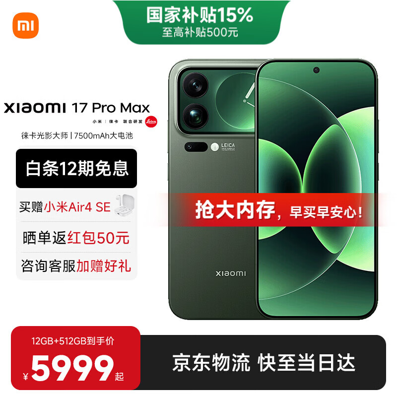 小米(MI)小米17promax 徕卡光影大师人像 第五代骁龙8至尊版 6.9英寸120Hz阳光屏 小米手机17promax 森野绿 12GB+512GB 【焕新补贴】