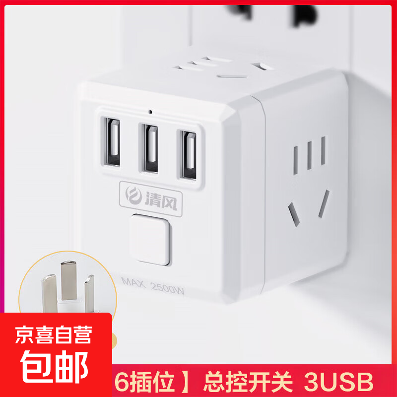 插座智能一转多魔方插座无线usb多功能插排家用宿舍大功率带线 无线 3U 3位 白色 总控开关