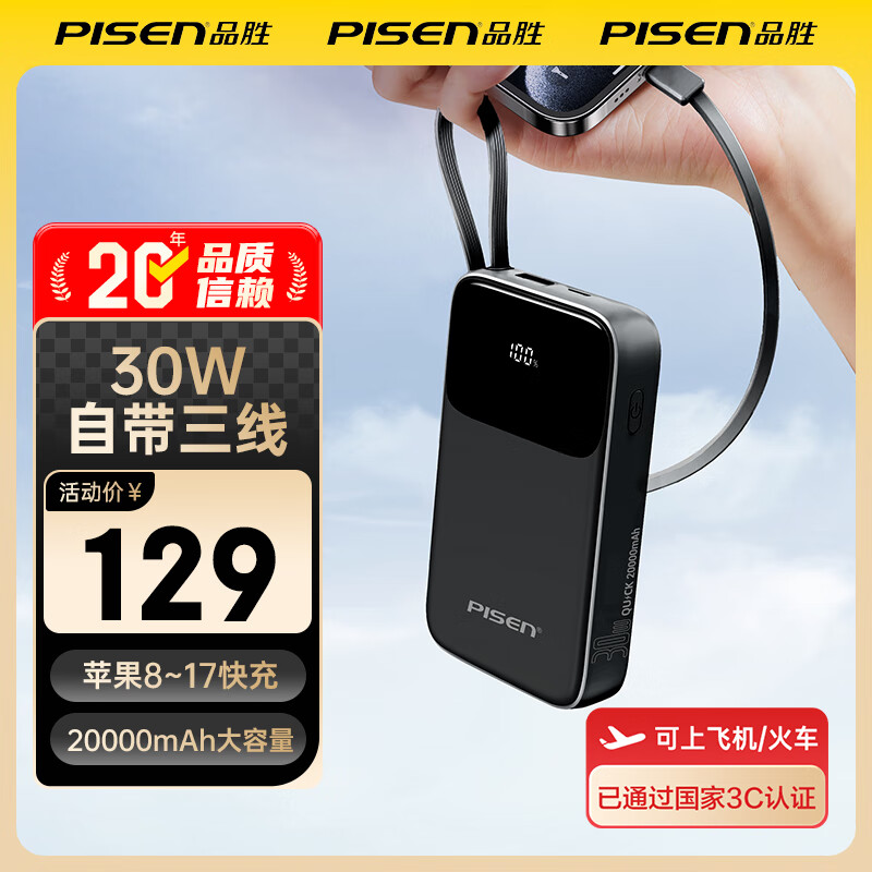 品胜(PISEN)【3C认证】充电宝自带三线20000毫安大容量可上飞机30W快充移动电源适用苹果17promax小米华为 黑色【30W带三线|2万毫安】