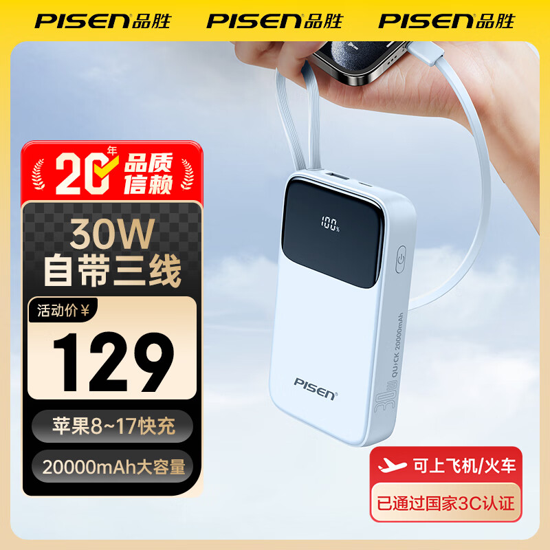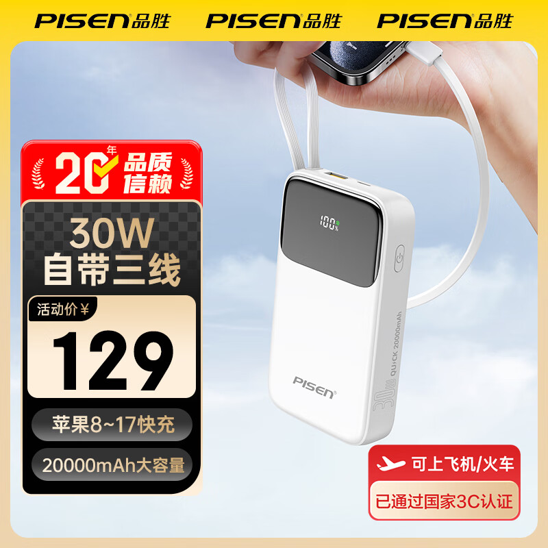品胜(PISEN)【3C认证】充电宝自带三线20000毫安大容量可上飞机30W快充移动电源适用苹果17promax小米华为 白色【30W带三线|2万毫安】