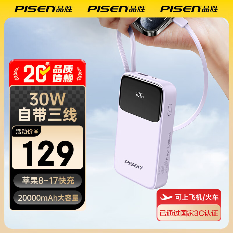 品胜(PISEN)【3C认证】充电宝自带三线20000毫安大容量可上飞机30W快充移动电源适用苹果17promax小米华为 紫色【30W带三线|2万毫安】