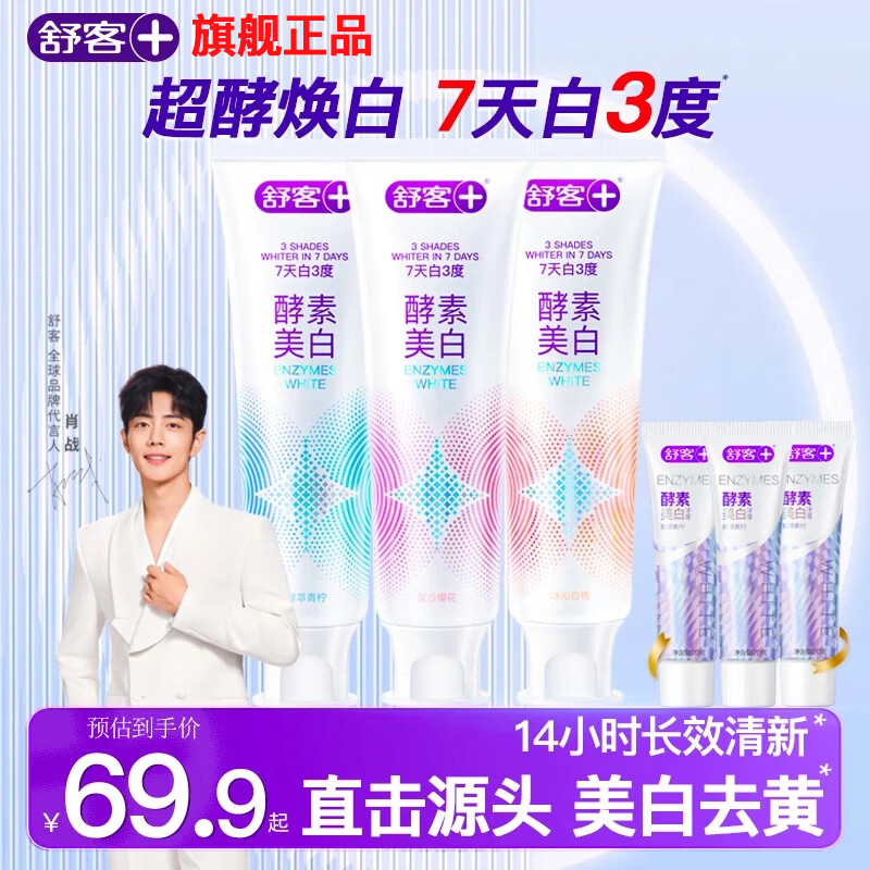 舒客美白色修酵素牙膏去黄去牙渍清新口气成人含氟去烟茶渍防蛀正品 茉莉+白桃+青柠 120g*3支