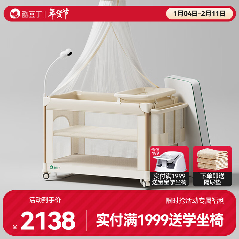 酷豆丁婴儿床可折叠可移动多功能智能拼接床便携新生婴儿床宝宝床 智能旗舰款plus