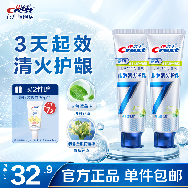 佳洁士(CREST)全优7效含氟牙膏7效合1防蛀固齿长效清新口气家庭家用囤货 【双支装】专研清火120g*2
