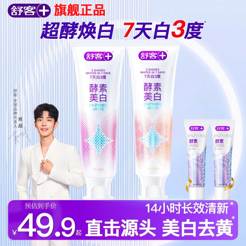 舒客美白色修酵素牙膏去黄去牙渍清新口气成人含氟去烟茶渍防蛀正品 樱花+白桃 120g*2支