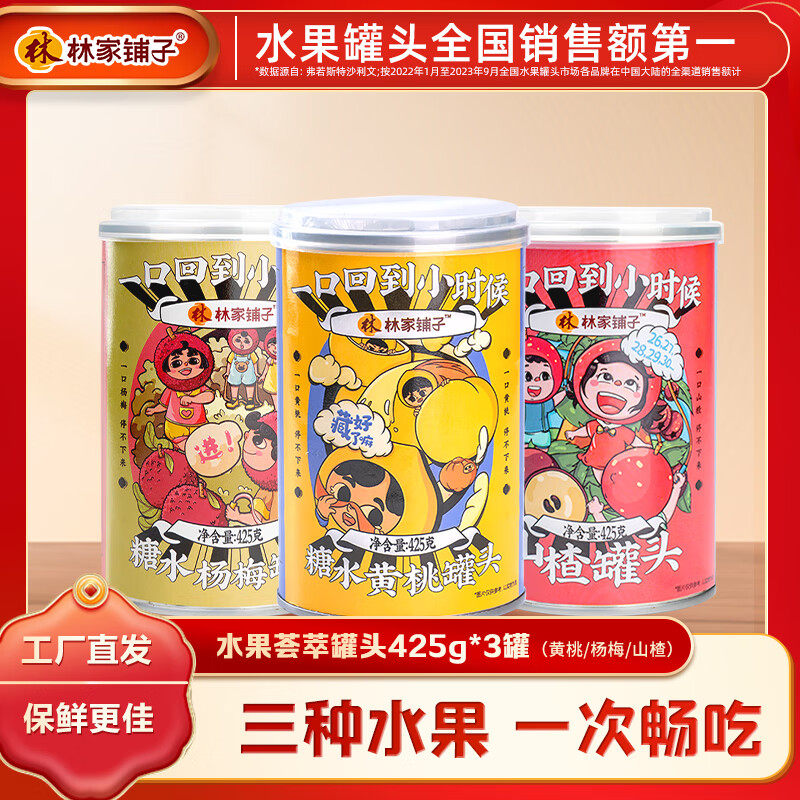 林家铺子黄桃桔子草莓什锦椰果雪梨山楂杨梅多口味水果罐头组合装425g/罐 【黄桃+杨梅+山楂】425g*3罐