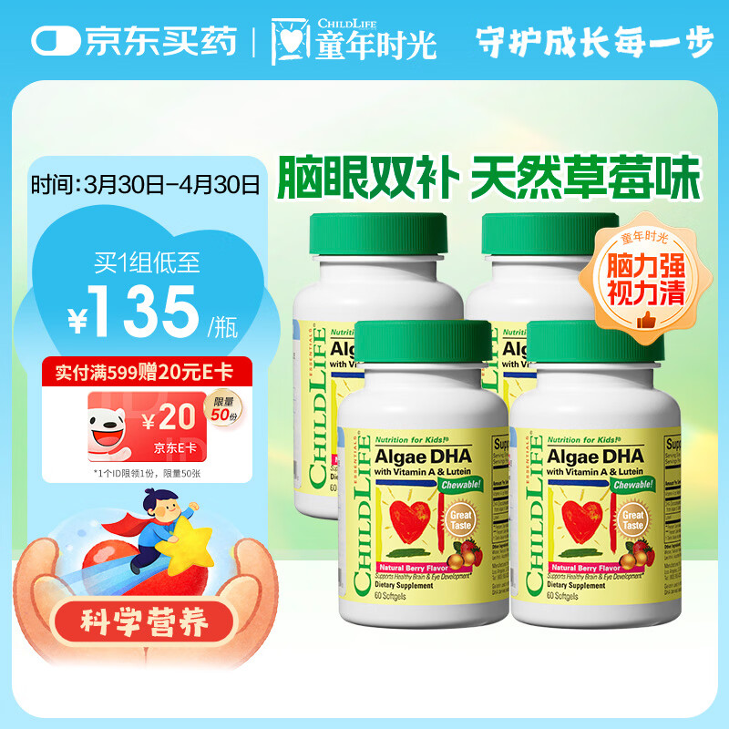 童年时光ChildLife婴幼儿童藻油dha0防腐学生青少年补脑dha60粒/瓶【4瓶】