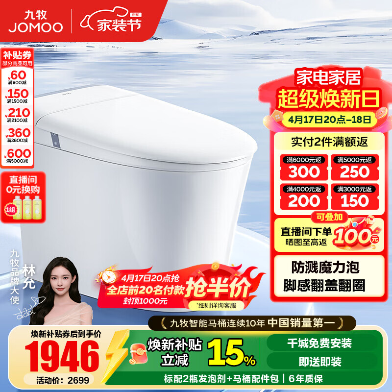 九牧(JOMOO)轻智能马桶家用卫生间恒温抗菌虹吸坐便器泡沫盾无水压限制SQ8650 【热销爆款】翻盖翻圈+防溅魔力泡 390以上选400