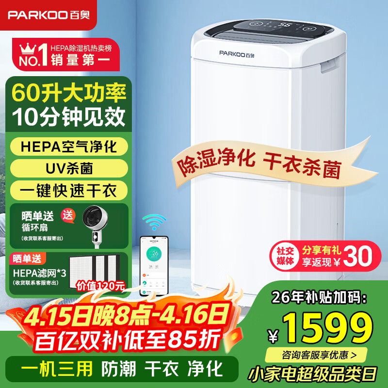 百奥(PARKOO)除湿机/抽湿机 除湿量60升/天120㎡家用除湿器地下室别墅商用大功率工业抽湿器 净化干衣PD602AR