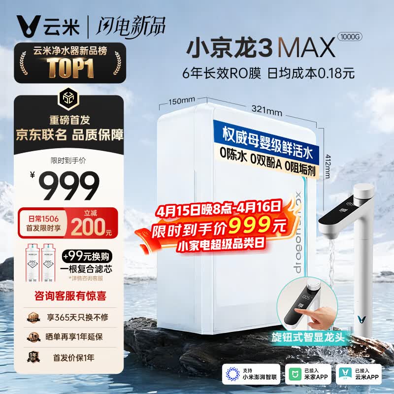 云米(VIOMI)小京龙3Max1000G厨下净水器6年长效RO膜反渗透家用用大通量0陈水0阻垢母婴直饮净水机VR1032