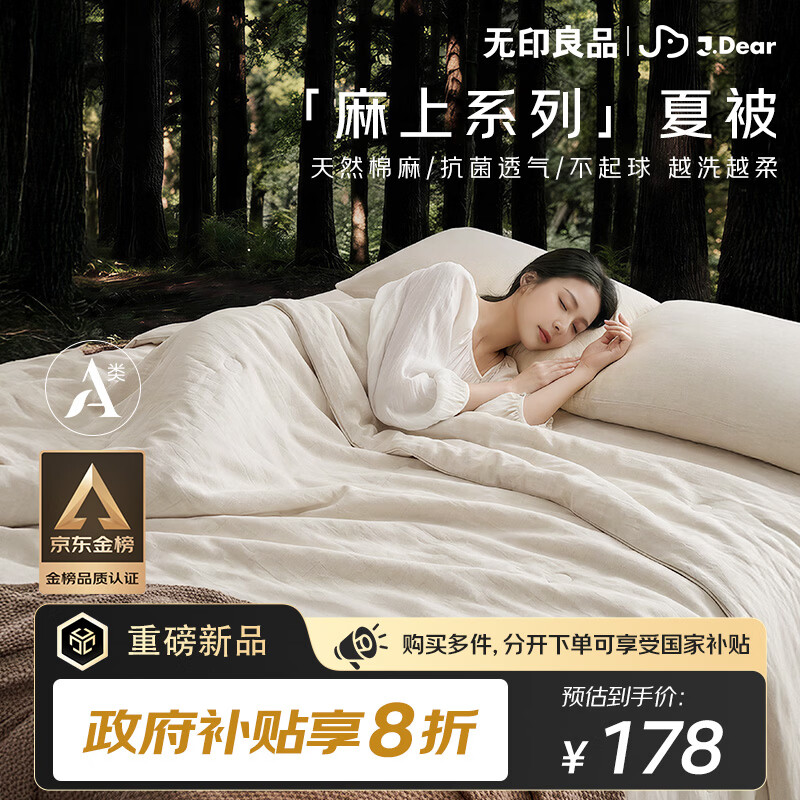 无印良品×JDear京东联名 麻上系列天然棉麻可机洗夏被A类抗菌150*200cm