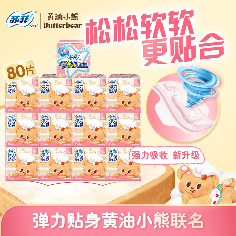 苏菲【黄油小熊联名】卫生巾夜用超熟睡420柔棉感量大姨妈巾旗舰店 日用组合 230mm 80片